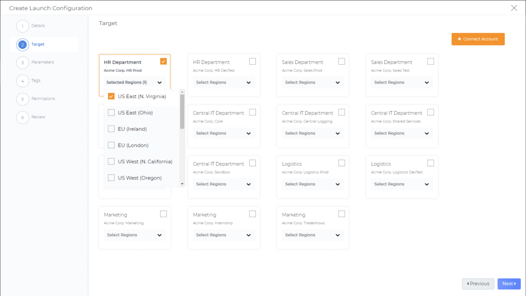 Next we select the “+ Create Launch Configuration” button, which opens the deployment wizard. Now, its time to name our new configuration and set the target departments and regions our users can deploy this blueprint. We can also align AWS Accounts to departments, so we don’t need to select or remember which individual accounts belong to the business units.