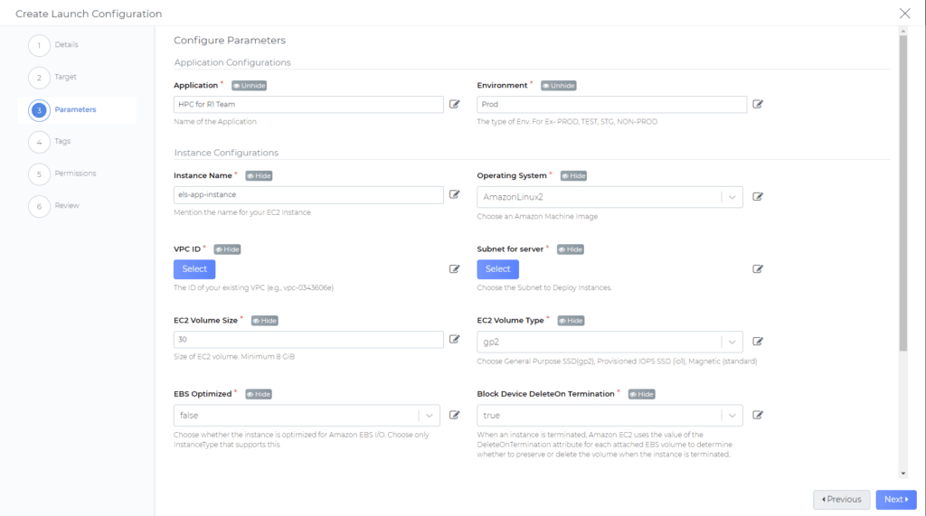 Next, we can decide which parameters will be visible to and/or editable by users. We can also selectively allow users to edit parameters within our guardrails. For example, we can allow users to choose from a range of EC2 Volume Sizes. In this example, let us hide Application name and Environment label.